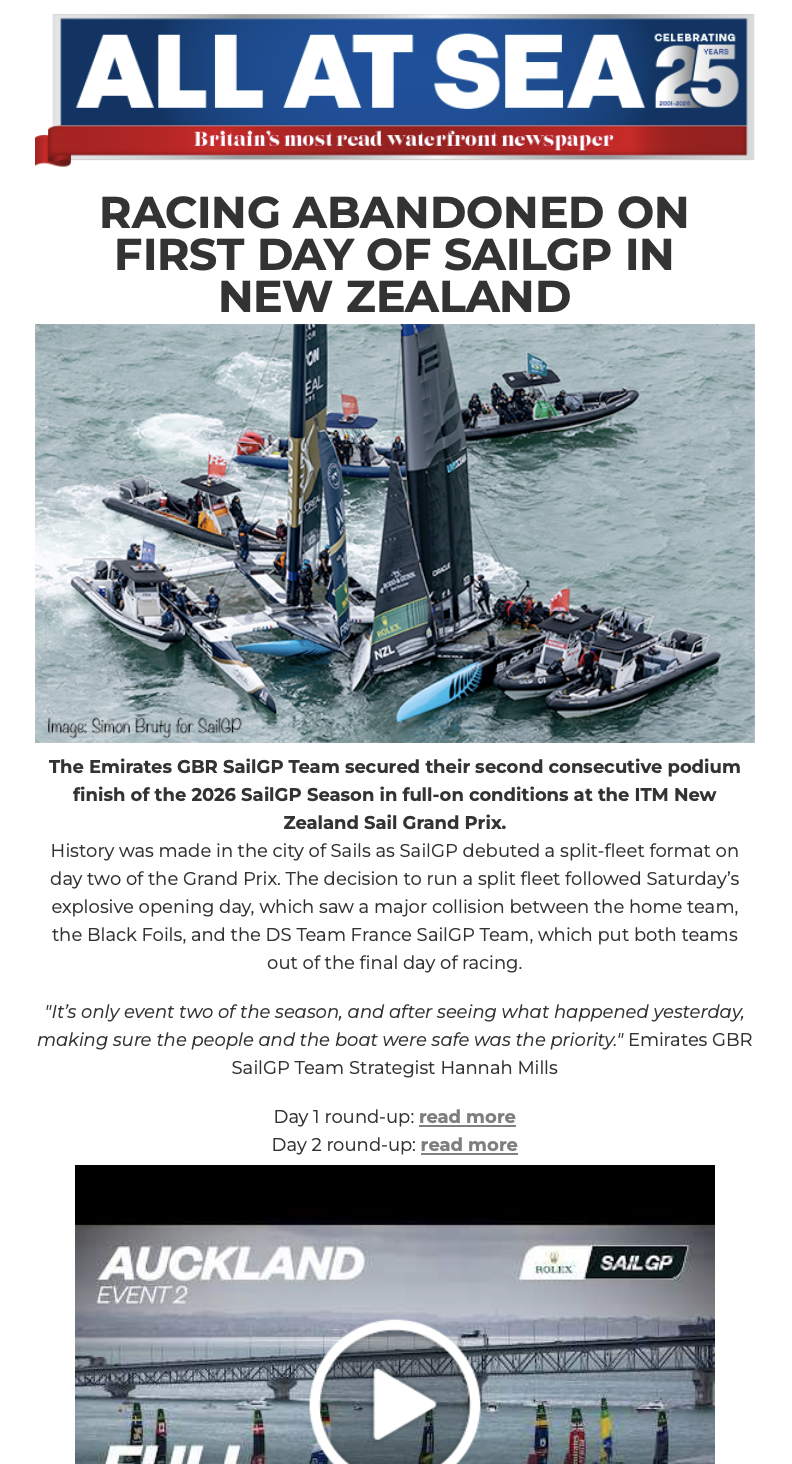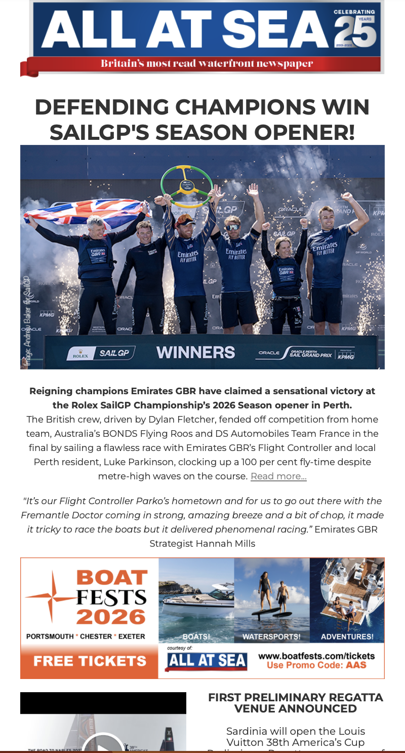 All at Sea’s popular weekly newsletter is packed with the latest boating news, videos and events, plus you can enter fantastic competitions.