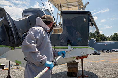 Before you tackle critical maintenance and the fouling control process, you will need appropriate personal protective equipment (PPE), including gloves, overalls with a hood and goggles or glasses, as well as a mask if you are removing old coatings. A tarpaulin is also recommended to place under the boat to collect scrapings and dust from sanding.