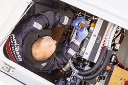 Engine service: Change oil and filters, flush coolant, check belts and replace impellers. Service fuel filters, gearbox or outdrive oil, and fog cylinders if storing long-term. For twin engines or high-performance set-ups, ensure both are synchronised. Outboard motors, including portable ones for tenders, will also need to be removed and serviced.