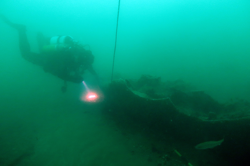 Diver diving the Pin Wreck – An Admiralty Mooring Lighter which sank in 1903 off the Dorset coast Protected as a Scheduled Monument. Image: Bournemouth University