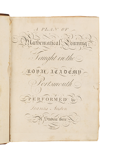 Francis Austen, known to his family as Frank, was born in 1774, a year before Jane. He first entered the Royal Naval Academy at Portsmouth at the age of 12. Francis’s mathematic coursebook from this time is included in the display. After graduating he quickly rose through the ranks from lieutenant to commander and was captain of HMS Canopus during the Napoleonic Wars.