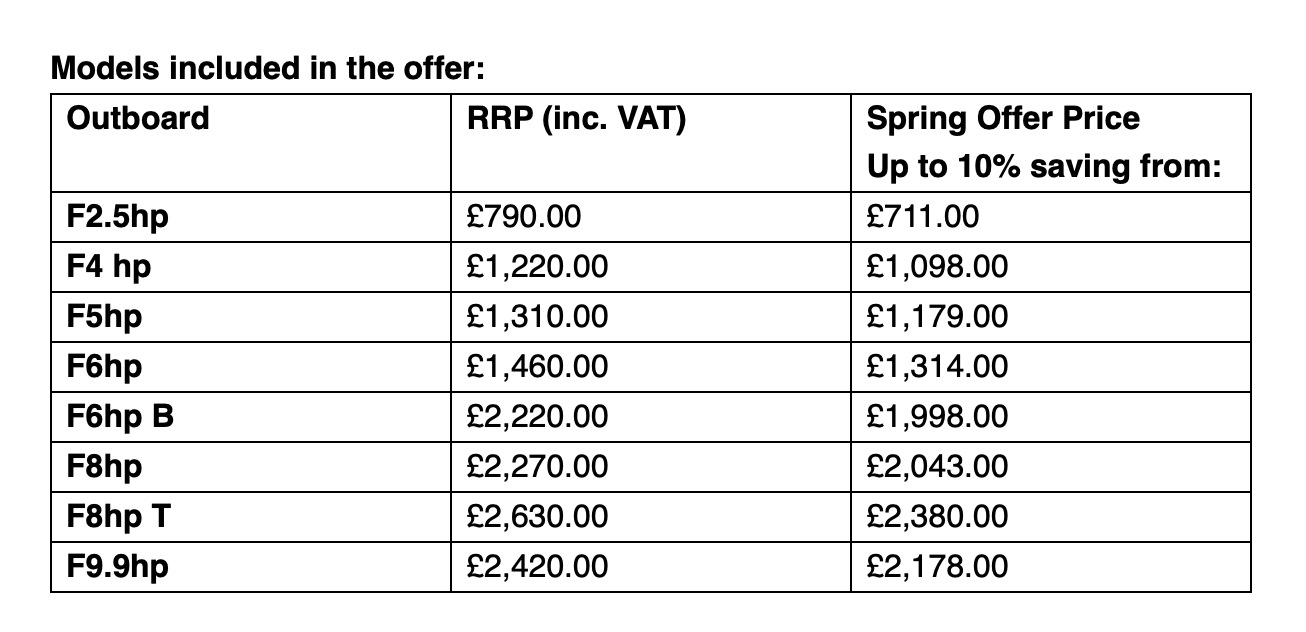 From 30 March – 31 May, boaters across the UK can take advantage of a limited offer on Yamaha’s highly regarded 2.5hp to 9.9hp outboard engines* (*T&C’s apply), with savings of up to 10 per cent.
