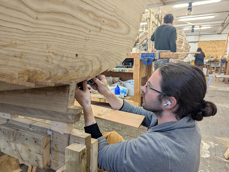 “It is intense, packing a full college curriculum into less than ten months, which is a huge undertaking for anyone. I probably made it harder than it needed to be in the beginning. I’m a perfectionist and spent many late nights in the workshop that perhaps could have been avoided. Moving downstairs, I was assigned to ‘Skylark,’ a fourteen-foot lug-rigged clinker dinghy designed by Paul Gartside and commissioned by Ariana Cottam. Skylark was later renamed ‘Lo Verily’ to honour our late tutor, Matthew Law.